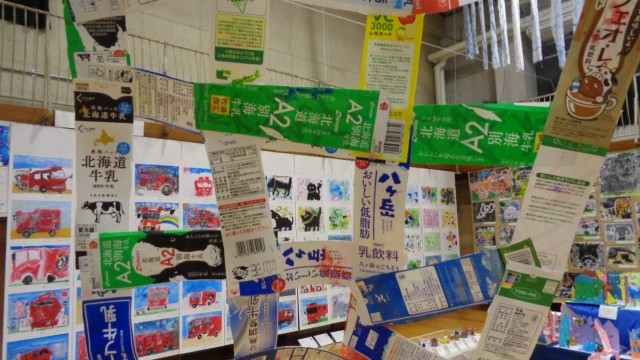 体育館入り口にある作品です。牛乳パックを使った作品のようです。あとは、会場でご覧くださいね。お待ちしております。