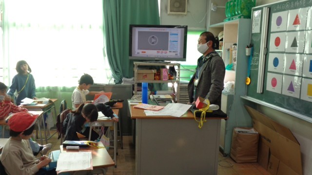 3年1組のようすです。講師の先生が外国語の授業をしていました。