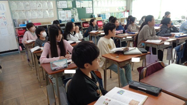 5年1組です。国語の古典の学習をしていました。竹取物語、平家物語について、ビデオ教材を使って学習していました。