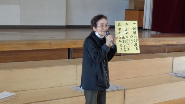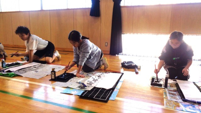 12日、4年生が体育館で、1月に行う席書きの練習をしました。