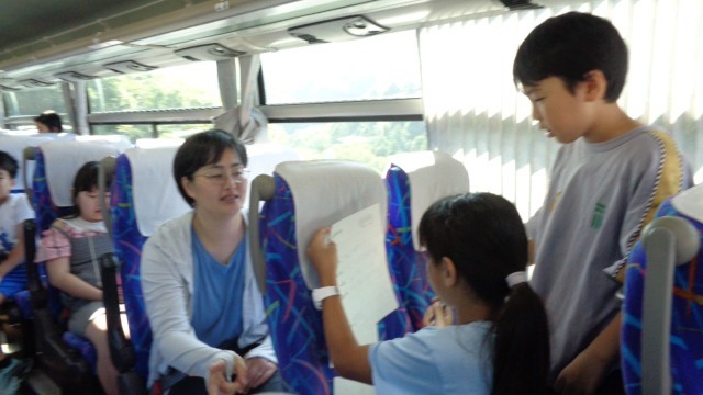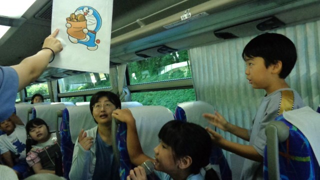 車内ではバスレクが始まりました。進行役も子どもたちが行いました。