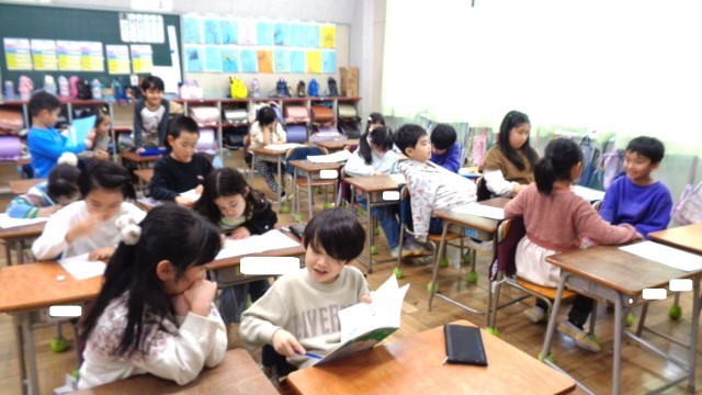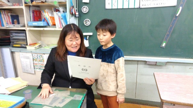 2年1組です。あゆみを渡していました。2学期よく頑張りましたね。