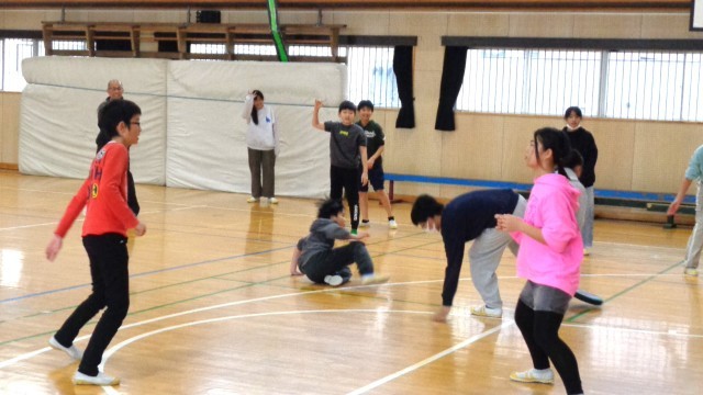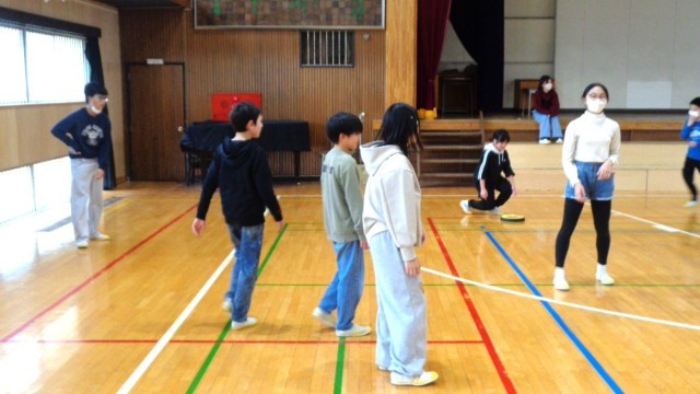 6年3組です。体育館で体を動かしていました。