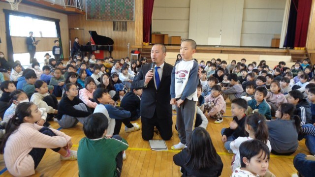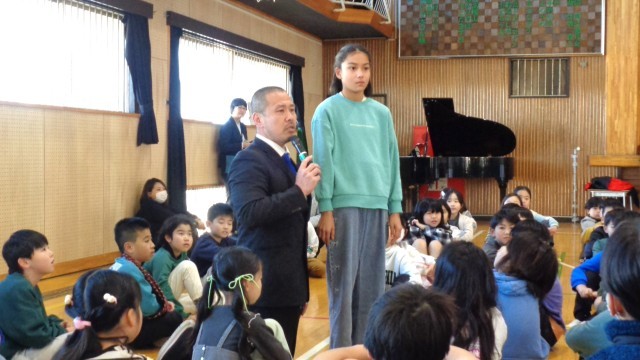 1月の生活目標は「れいぎ正しくしよう」です。登校の見守りでたっていた先生に、元気に挨拶をしてくれた2人を紹介しました。いつも元気に挨拶をしてくれる2人です。