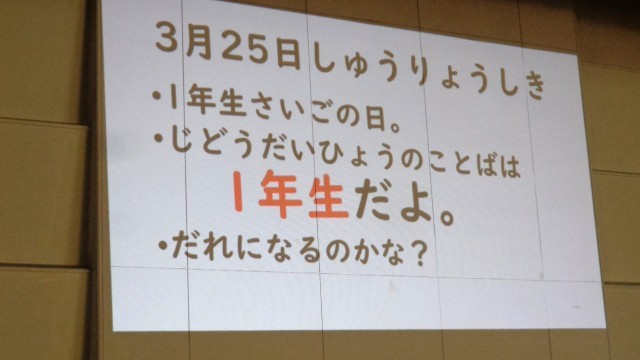 4月から2年生になる1年生です。3学期どんな行事があるのか、2年生に向けての心構えなど、先生から話を聞きました。