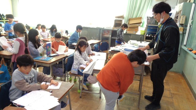2年3組です。書初めの清書をしていました。先生が確認しています。ほとんどの子が提出し終わったようですね。