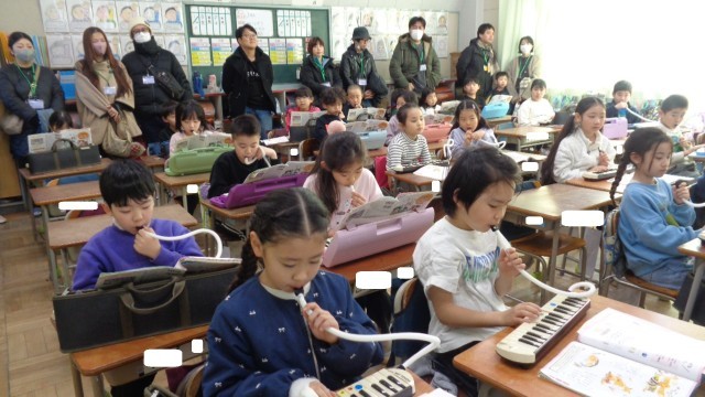 2年1組です。音楽の授業で「小ぎつね」の曲を学習していました。鍵盤ハーモニカも上手でした。