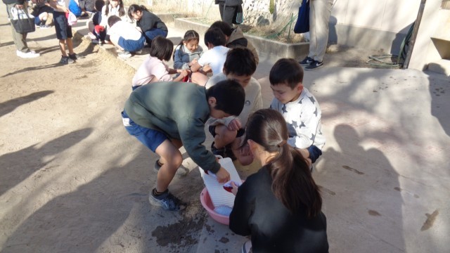 洗濯板を使って赤白帽を洗っていました。寒い中、頑張りましたね。