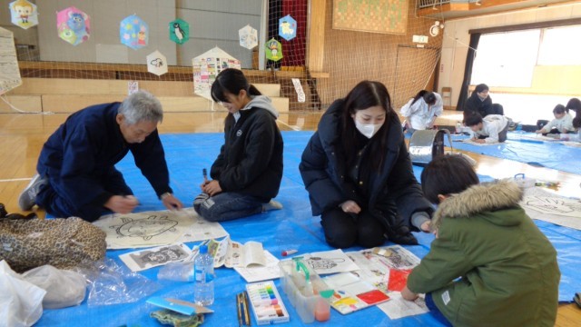 凧作りがスタートしました。まずは考えてきたデザインを下書きします。