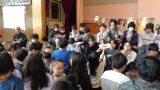 4年生一人ひとりが、縦割り班でお世話になった6年生に、一緒に撮った写真を手作りのフォトケースに入れて渡しました。