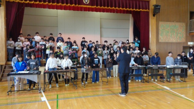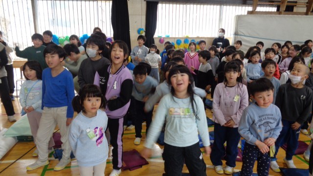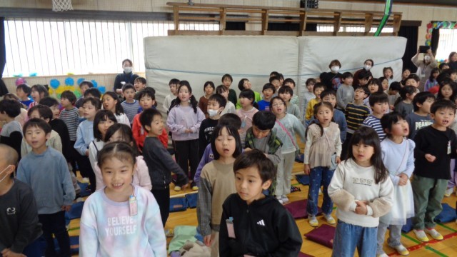 6年生の伴奏で、みんなが「風になりたい」を歌っています。1年生が元気な声を出してくれていました。