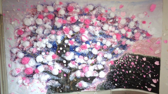 最後は6年生を全員で見送ります。南校舎の壁面には4年生が作った作品が飾られています。