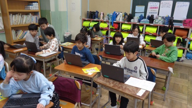 最後は1年生です。1の1はタブレットを使って、ドリルパークの問題演習に取り組んでいました。