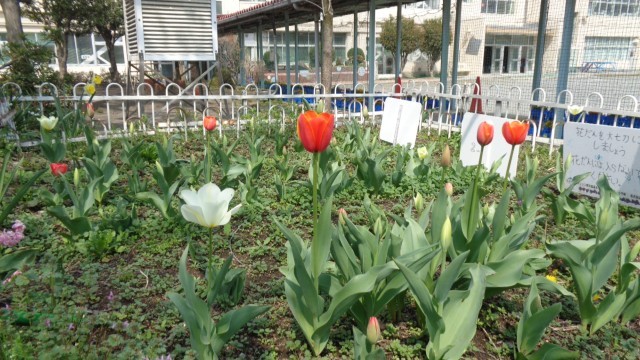 花壇のスイセンやチューリップもきれいに咲いています。