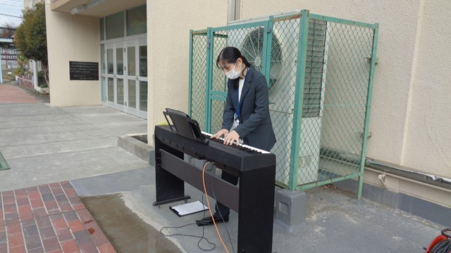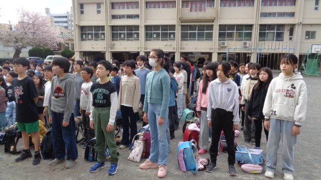 始業式が始まり、6年生児童が代表の言葉を話しました。校歌も生伴奏です。6年生も元気よく歌いました。