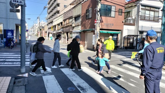 お花屋さんがる通学路は、たくさんの子が通う道です。