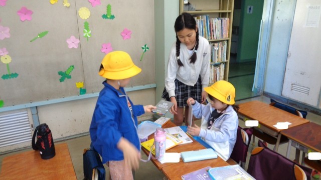 1年生の目線までしゃがみ、名札を付けてくれている子もいます。