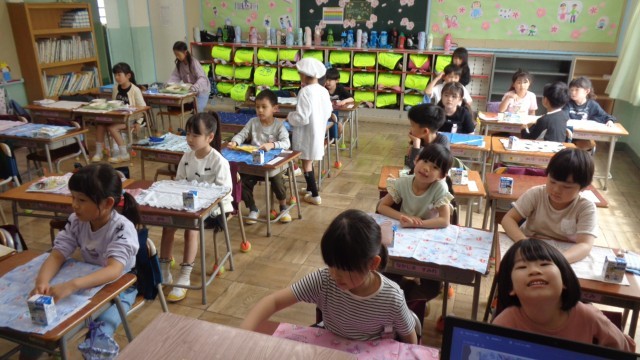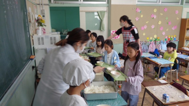 1年生は今日から給食が始まりました。給食当番も初めてです。準備は大丈夫なようですね。待っている子も姿勢よく待てました。