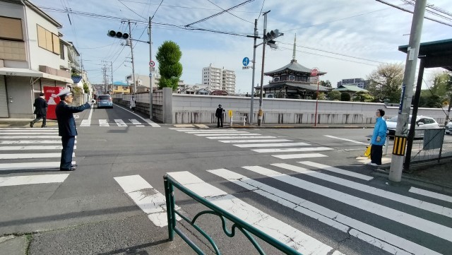 交差点では安全ボランティアの方や交通安全協会の方、保護者の方が見守りをしてくれています。