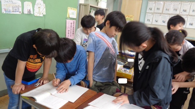 友達がノートに書いた意見を、みんなで見合っていました。