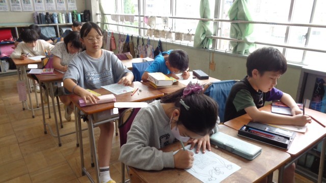 5年生の教室では、離任式に渡すお手紙を書いていました。