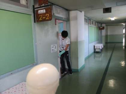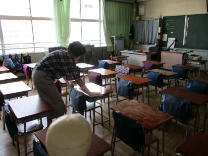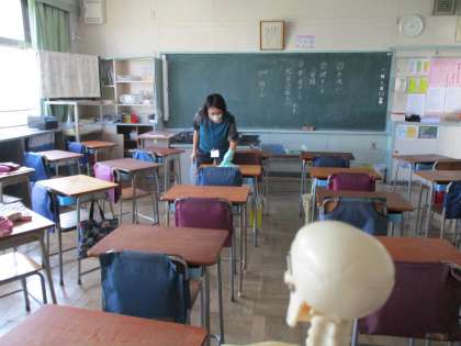 子供たちが帰ったあとは、毎日先生たちが机やイス、いろいろなところの扉や手すりを消毒しているよ。