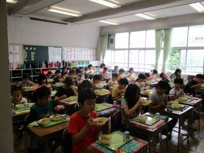 手ばやに準備をして、どの学年も前を向いて本当に静かに食べています。「ちょっと不思議な感じ」と言っている子もいました。今は少し我慢です。