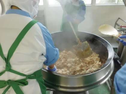 かてめしの「かて」は「まぜる」という意味で、昔はお米が貴重でたくさん食べられなかったため、野菜などをまぜて量を増やしたのがはじまりです。今回は鶏肉や野菜などを入れています。桑都焼きは桑の葉パウダーの入ったソースをかけて焼きました。そうめんを絹糸に見立てたお吸い物にはシルクパウダー入りの団子が入っています。