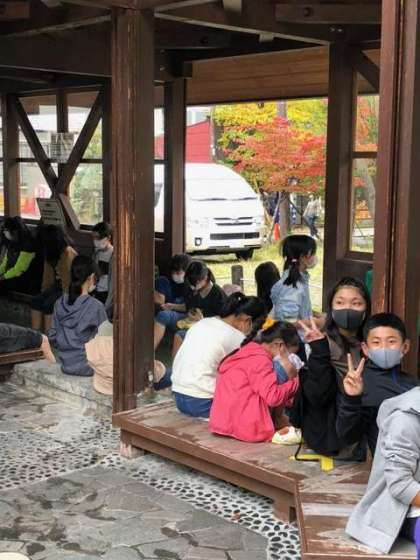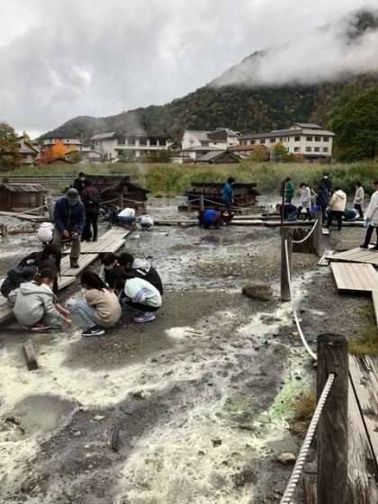 男体山が雲に隠れていたので、三本松での学年写真を明日にまわしました。時間に余裕ができましたが、足湯にもう一度入りたいとのリクエストが多かったので、源泉見学と足湯をクラス毎ローテーションで行いました。最初は1組足湯、2組源泉。