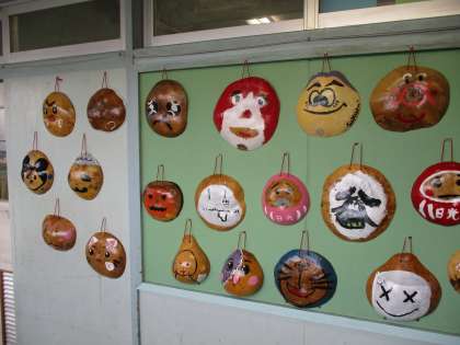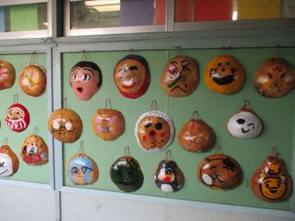 6年生の教室の廊下掲示板に、10月に行った日光移動教室で作成したふくべ細工が掲示されています。