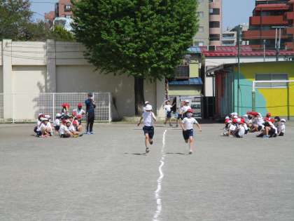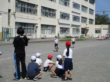 3年生は合同体育。50メートル走のタイムをはかっていました。すごい歓声。