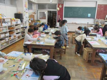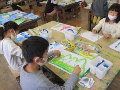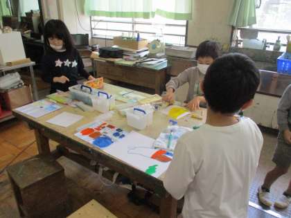 2年生が図工室で絵の具を使って絵を描いていました。楽しそう。