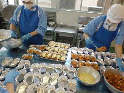 給食室では一人ずつ丁寧に盛り付け作りました。