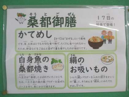 今日の給食メニューは桑都(そうと)御膳です。うまし。