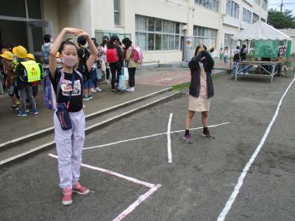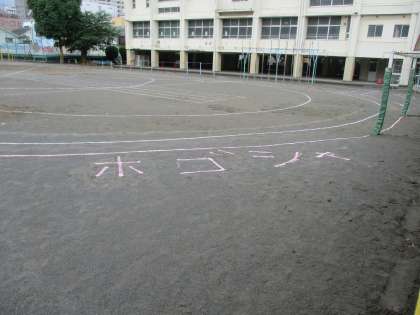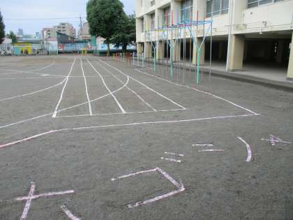 校庭の主にトラック外周に、ピンク色のラインが引いてあります。ラインの外側での参観をお願いします。子供たちの動線を確保するために少しわかりにくい部分もありますが、よろしくお願いします。