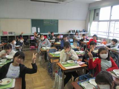 本当は語らいながら食べたいよね。でも楽しそうな様子はうれしいよ。4年生と6年生。
