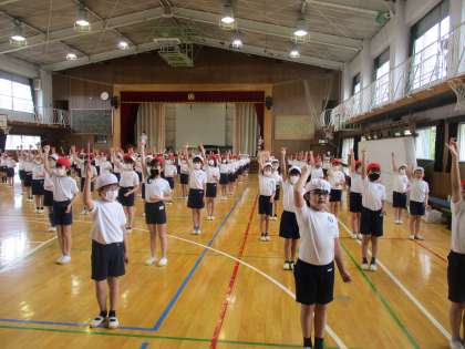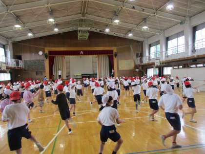 3、4年生、今日は雨なので体育館で練習です。うまくなってきたね。