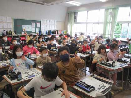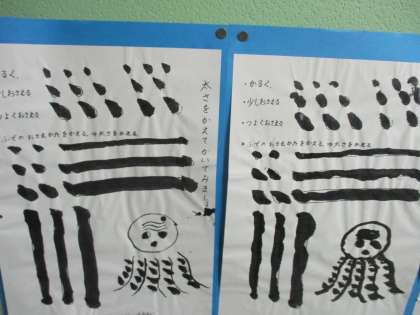 3年生で書写がはじまります。教室廊下に、いろいろなふでづかいが掲示してありました。タコがいいね。画像の授業は4年生の書写です。