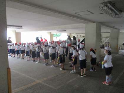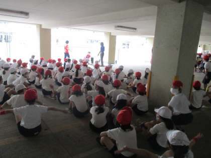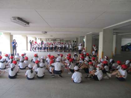 1、2年生、校庭で運動会の練習をしていたらパラパラと雨がふってきました。ピロティに避難して、いろいろ動きの確認です。