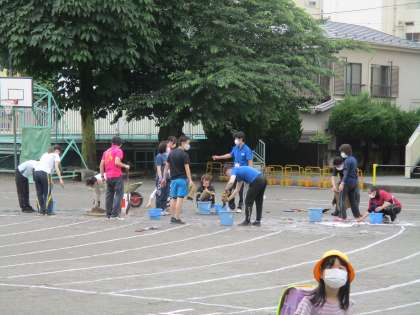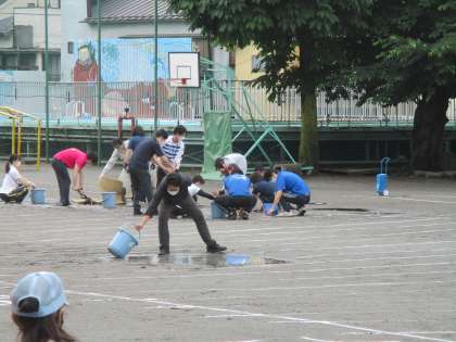 今日はスポーツテストの校庭種目を実施予定なので、朝から職員総出で校庭整備です。水たまりの水をすいとって砂入れをします。