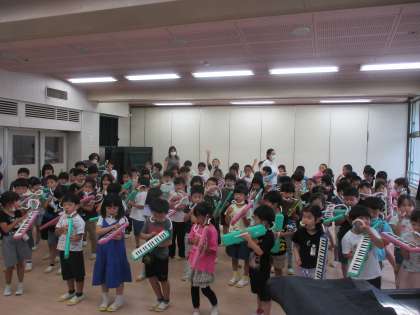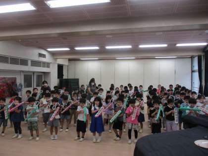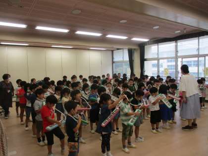 1年生、学年合同で150周年に向けての音楽練習です。みんなじょうずだったね。