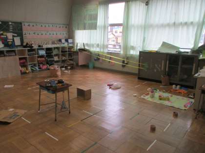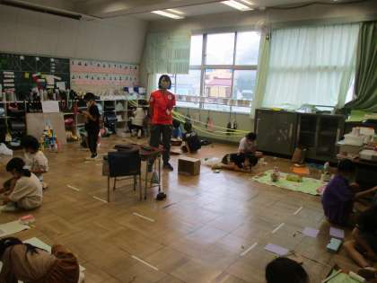 2年生が生活科でおもちゃらんどを作っています。この学級でも教室中を使って制作です。途中、体育のため教室が抜け殻になっていましたが、その後再び再開。