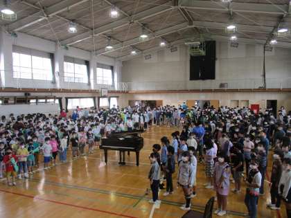 今日は久しぶりに全校児童が体育館に集まっての音楽集会です。10月6日、創立150周年を祝う集会で演奏したり合唱したりする「喜びの歌」をみんなで練習しました。