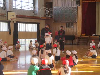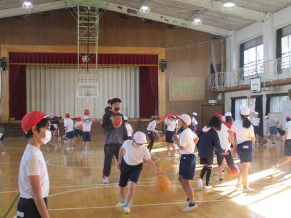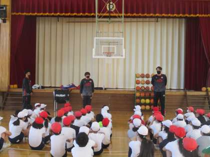 今日は5、6年生対象に八王子市をホームタウンにするバスケットボールチーム、「ビートレインズ」の方においでいただき、バスケットボールについて実技指導をしてもらいました。最初は5年生。