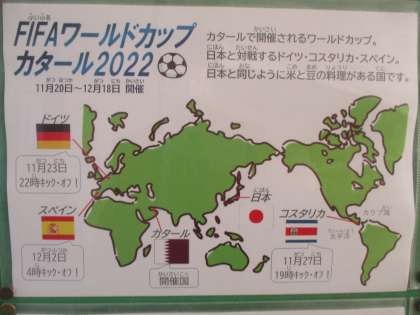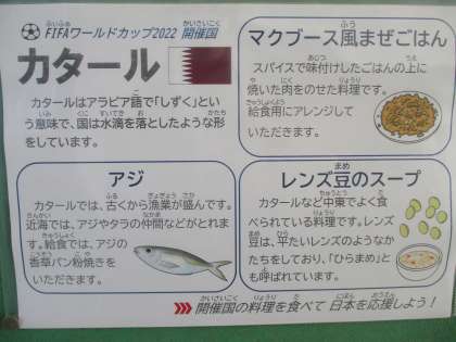 昇降口の掲示板に、ワールドカップ2022にちなんだ各国の食の紹介がはってあります。