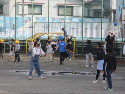 みずたまりをよけて遊びます。