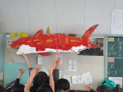 トロフィーを見せてくれた後、「教室には段ボールで作ったメガロドンもいるよ」と言うので見てきました。よくできています。