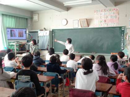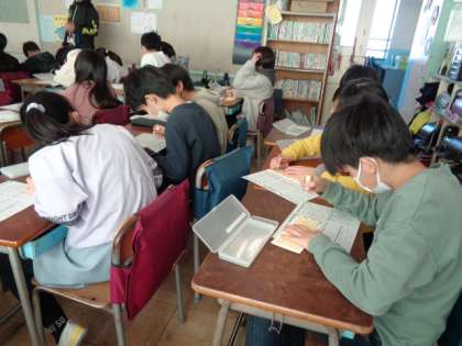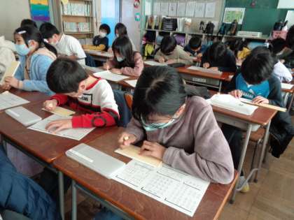 社会福祉協議会の方においでいただき、視覚障害について学びました。点字の体験もしました。