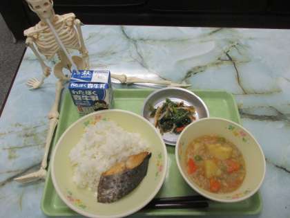 さわら(鰆)の幽庵焼き(幽醤油・酒・味醂の調味液にユズを入れたものを用いた魚の付け焼き)、ジャガイモのそぼろ煮、ほうれんそうともやしのごまあえ)なり。