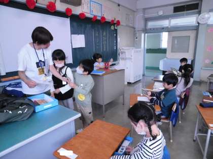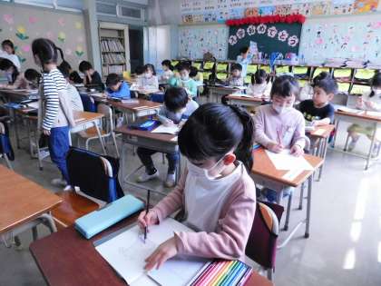 1組です。プリントに自分の名前を書いていました。終わった子は読書をしていました。
